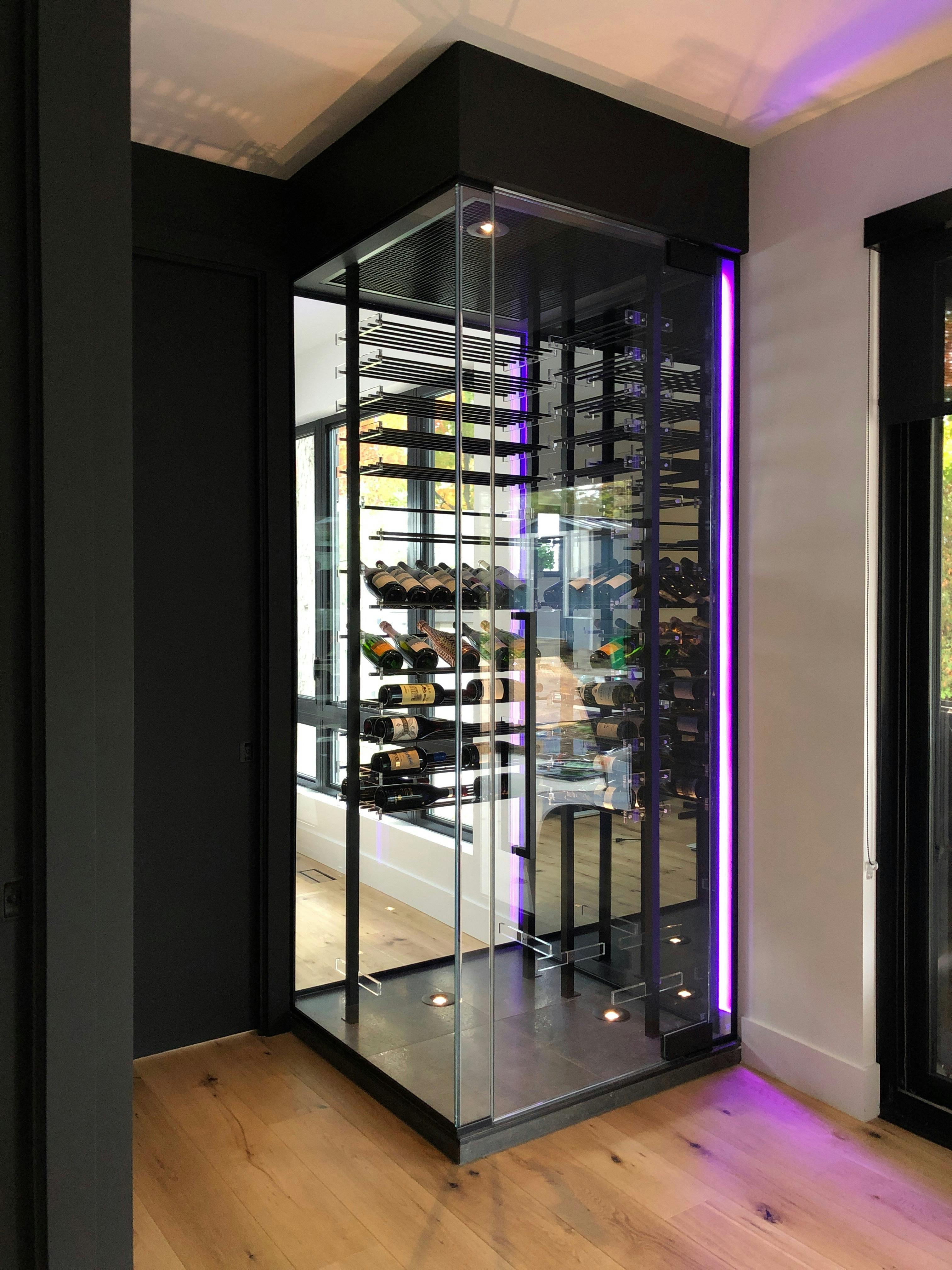 Caves vitrées en zone de vie, pièces dédiées, sous‑sols aménagés. Silence quand le salon l'exige ; non silencieux assumé quand l'usage et l'implantation le permettent. Toujours : climat maîtrisé et finitions nettes.